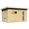 Das Design des Saunahauses »Melina« ist sowohl funktional als auch ästhetisch ansprechend. Die großen Glasflächen der Tür und der Fenster lassen viel Tageslicht in den Innenraum und ermöglichen einen schönen Blick in den Garten. Die helle Farbe Beige verleiht dem Saunahaus eine freundliche und einladende Optik.